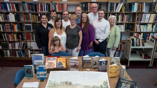 The McLoney siblings; their family members, Christie Weininger, HPLM executive director and Becky Hill, head librarian, with some of the materials from the collection. Pictured are (front from left) Stella Lee, Kimberly Lee; Karen Stormer (daughter), Gail Klein (daughter), Dillon Klein, Hill and (back, from left) Weininger, Brian Keating, Dr. Mark McLoney (son), Phil Stormer and Bill Klein.